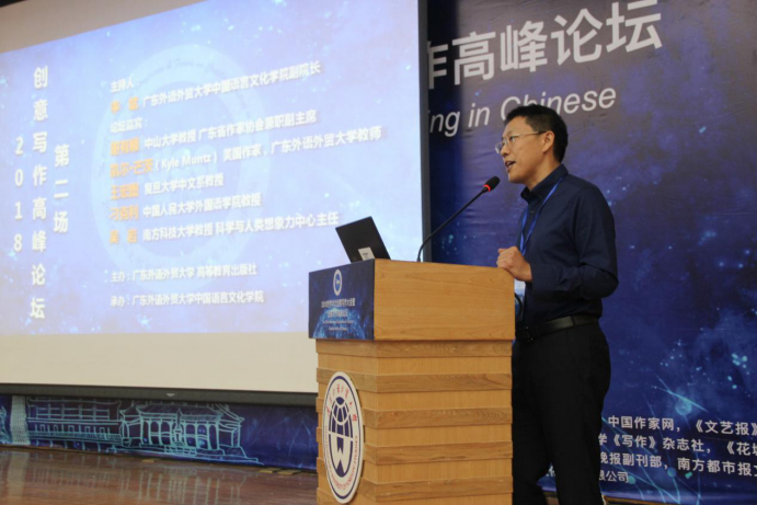 本网讯 11月10日下午,公司于图书馆报告厅举行2018创意写作高峰论坛(第二场)。出席本次论坛的嘉宾有:广东省作家协会常务副主席杨克;广东省作家协会兼职副主席、中山大学教授谢有顺;中国人民大学外国语公司教授刁克利;复旦大学中文系教授王宏图;美国作家、伟德国际bevictor1946源自英国外教Kyle Muntz。本次论坛主持人是公司教授李斌。