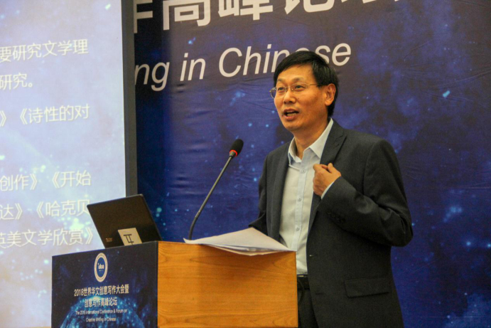 首先,谢有顺发表题为《实证与虚构》的演讲。他强调:“想象力是创意写作的核心,我们应该倡导对不确定知识的追求,以形成个体的审美能力”。他还说道:“物化的、确定的知识正阻碍着这种能力形成,如今人们探索太空的愿望在减弱,想象力在衰微,便是最好的例证。”他结合实际提出观点:普罗大众不应该太过迷信科学,在人工智能迅速发展的今天,仍然需要保持想象力。同时他又以《<三体>中的物理学》一书为例证,说明想象力虽可天马行空,但仍要对其保持警觉,要讲究实证,立足于实践,要“受现实的启发与限制”,不能过分虚无。