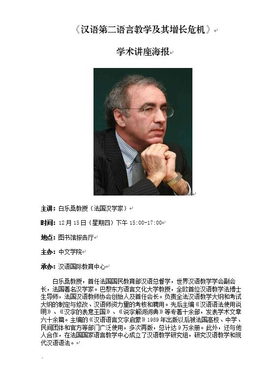 12月14日至22日,法国著名汉学家、汉语教学专家白乐桑教授即将到校,受聘公司客座教授,并为汉语国际教育中心师生带来《汉语第二语言教学及其增长危机》、《法国汉语教学现状与问题》、《学习动机——以法国汉语学习者为例》、《中法语言政策比较》、《法国汉语教育史及其文化背景》等精彩的学术报告。