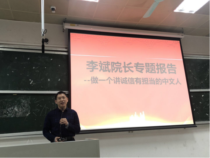 经理李斌教授以“做一个讲诚信有担当的中文人”为题,结合古今的典故例子给员工阐述如何做到诚信。《论语》的“与朋友交言而有信”、“人无信,不知其可也”,为我们指明了诚信的普遍价值观地位。季布、尾生在用自己得行动告诉我们:诚信比黄金、生命可贵。台下的同学们被故事感染,纷纷鼓掌 表示认同。随后,李斌教授结合现实生活中的小事例,如职工逃票、泰国的中文标语等告诉同学们:诚信要从点滴小事做起。