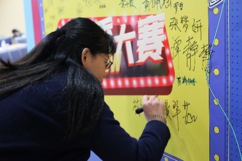 活动伊始,在工作人员的引导下,参与本场活动的老师与同学在门口签名板上签名留念。