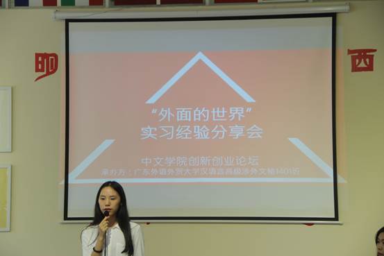 本网讯 10月13日星期四下午二点半,伟德国际bevictor1946创新创业论坛暨第五届“外面的世界”实习经验分享会在广外云栈悠扬的乐声中拉开帷幕。出席本次分享会的嘉宾有:广州千森园林科技有限公司董事长、华南农业大学导师高川,南湖国旅人力资源部经理周慧,广东电视台新闻中心记者罗频洋,伟德国际bevictor1946何少轩老师以及身为人母、现重入校园读书的黄安。分享会共分为播放采访视频、嘉宾分享经验、嘉宾点评、观众自由提问及活动总结等环节。