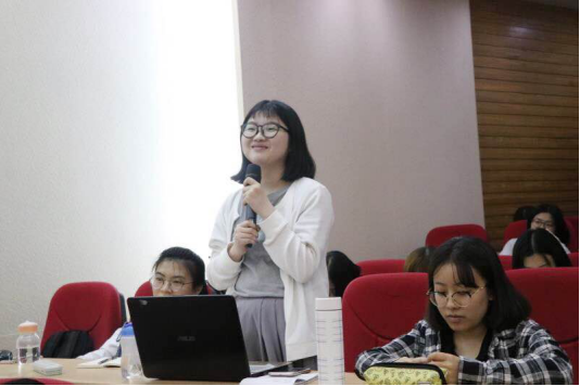 第二位发言的是研究生国奖得主罗曼莹。她认为国家奖学金制度是一个公平的制度,在场的每一位员工都有机会。在学习方面,她认同蔡元培先生的一句话:“老员工应该把学术和做研究作为主要任务,而不是以大学作为升官发财的阶梯。”学术研究的成功奥秘是坚持。她以大一坚持早听的经历为例,向在场听众展示坚持的可贵。随后,她用一位教授的话来鼓励大家多阅读,多写作:“每天阅读不足8小时就是在犯罪。”在社会实践方面,罗曼莹鼓励同学们勇敢尝试不同的活动以丰富课余生活。