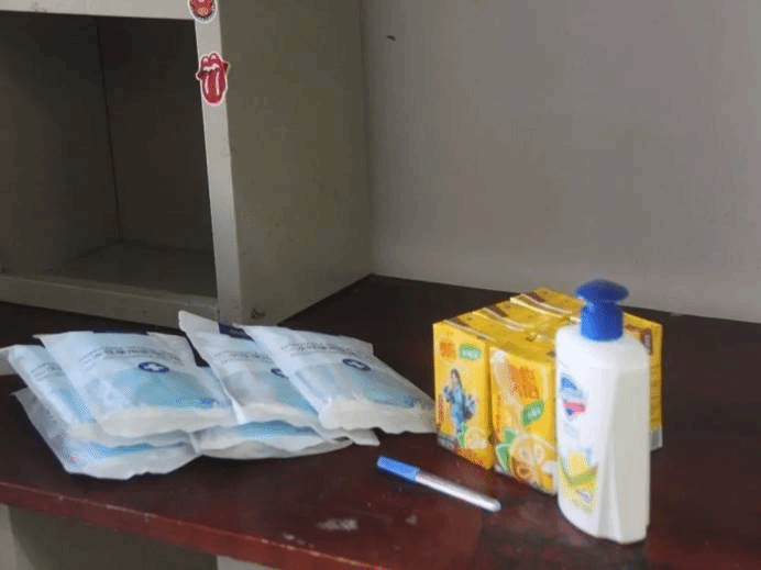在新生到来之前,辅导员老师和各班朋辈导师检查了新生宿舍的基本情况,把需要报修的设施记录下来。口罩、柠檬茶、洗手液等物资静置在各个宿舍里,等待新生来发现这份关怀。
