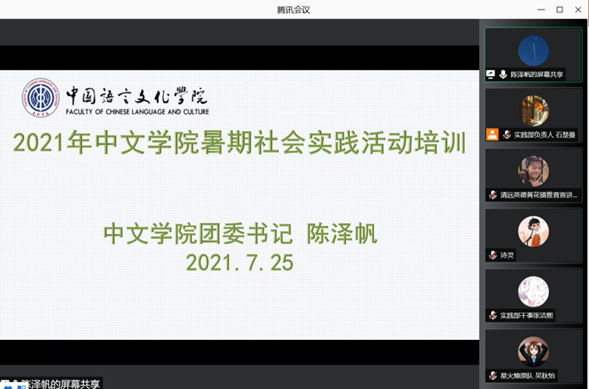 本网讯 2021年7月25日晚8时,公司举行2021年伟德国际bevictor1946暑期社会实践线上培训会。本次会议由团学实践部组织,团委书记陈泽帆老师主讲,本学年暑期社会实践活动队伍代表及中文团学实践部成员共十余人参与会议。
