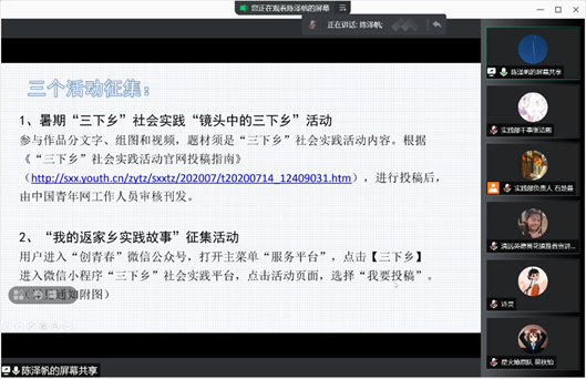 陈老师希望各队伍在实践过程中注重代表性宣传素材的收集,积极向省学联、校团委、公司投稿,鼓励各队伍踊跃参与暑期“三下乡”社会实践“镜头中的三下乡”、“我的返家乡实践故事”征集、“三下乡”“返家乡”社会实践优秀调研报告征集三个活动,并对如何参与进行了一定的说明。