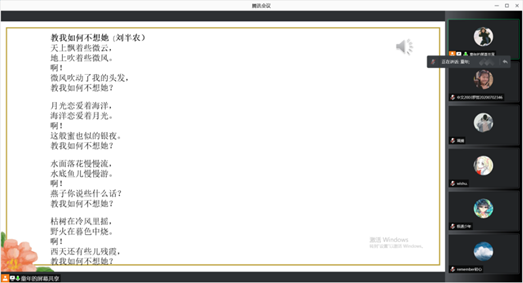 本课题主要涉及经典诗歌的欣赏及诵读。教学组成员们为同学们讲解了古诗《满江红》以及现代诗《教我如何不想她》,并引导员工们有感情地进行朗诵,目的是提高同学们的朗诵能力,加深同学们对中国诗歌文化的认识。