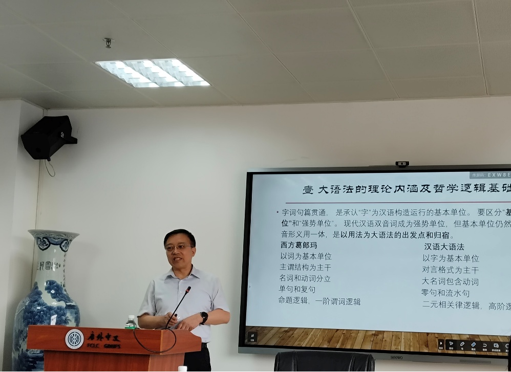 讲座伊始,史教授引用沈家煊先生大语法理论详细解释其与传统语法理论的区别,并将其概括为:以对话互动为根本,以对言格式为主干,字词句篇贯通,音形义用一体,传情达意不二,历时共时交织。他指出汉语与西方语言相比汉语呈现出少形态和主观性强的特点。史教授先是从哲学角度分析中西范畴观的不同;其次通过对比汉英差异,论证汉语是一门主观性丰富的语言;最后通过多个语言实例,说明语义、语用、韵律等方面对语法产生的不同作用。