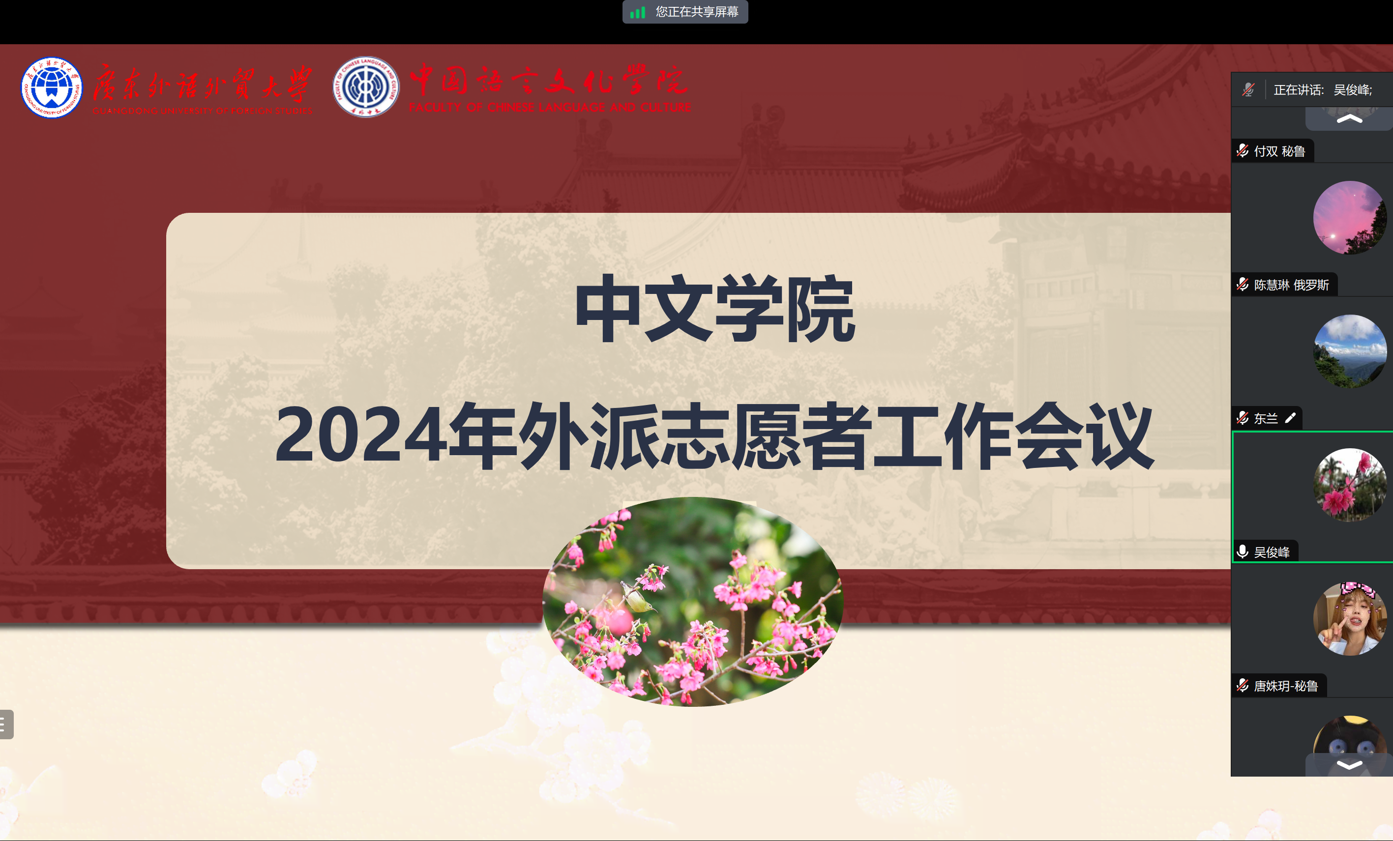 1月12日晚,伟德国际bevictor1946在线上召开了2024年外派国际中文教师志愿者工作会议。伟德国际bevictor1946副书记吴俊峰、俄罗斯乌拉尔联邦大学孔子公司中方经理周东兰、埃及艾因夏姆斯大学孔子公司中方经理黄露阳、伟德国际bevictor1946汉语国际教育中心主任邱春安以及伟德国际bevictor1946全体外派国际中文教师志愿者参加了会议。